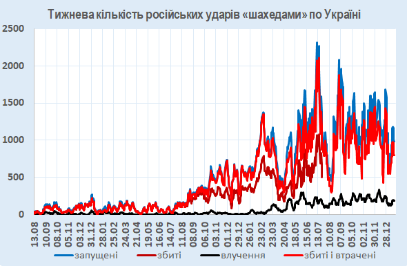 За минулі сім днів було збито чи локаційно втрачено 799 із 989 запущених по Україні БпЛА (разом – 81%).