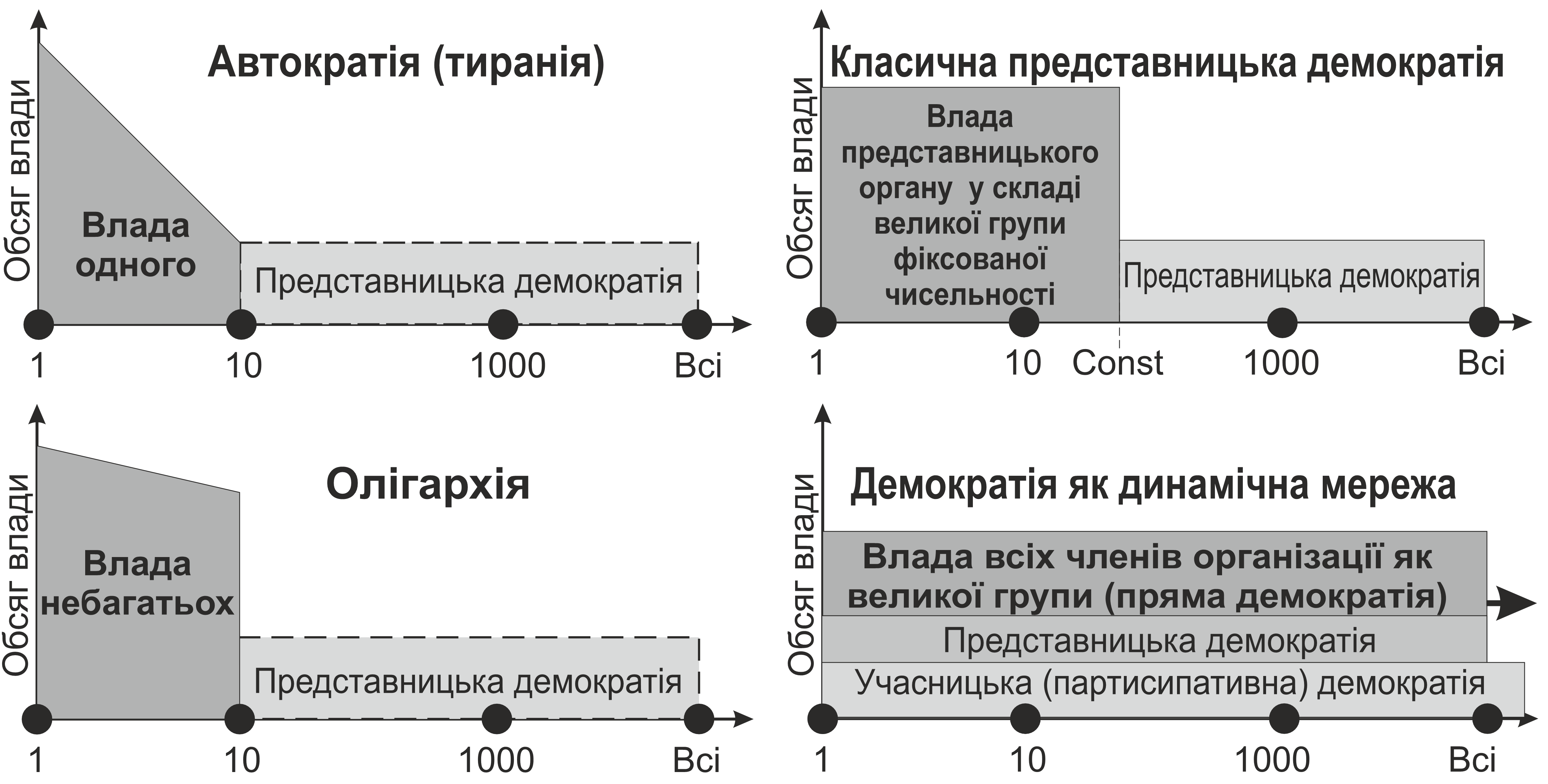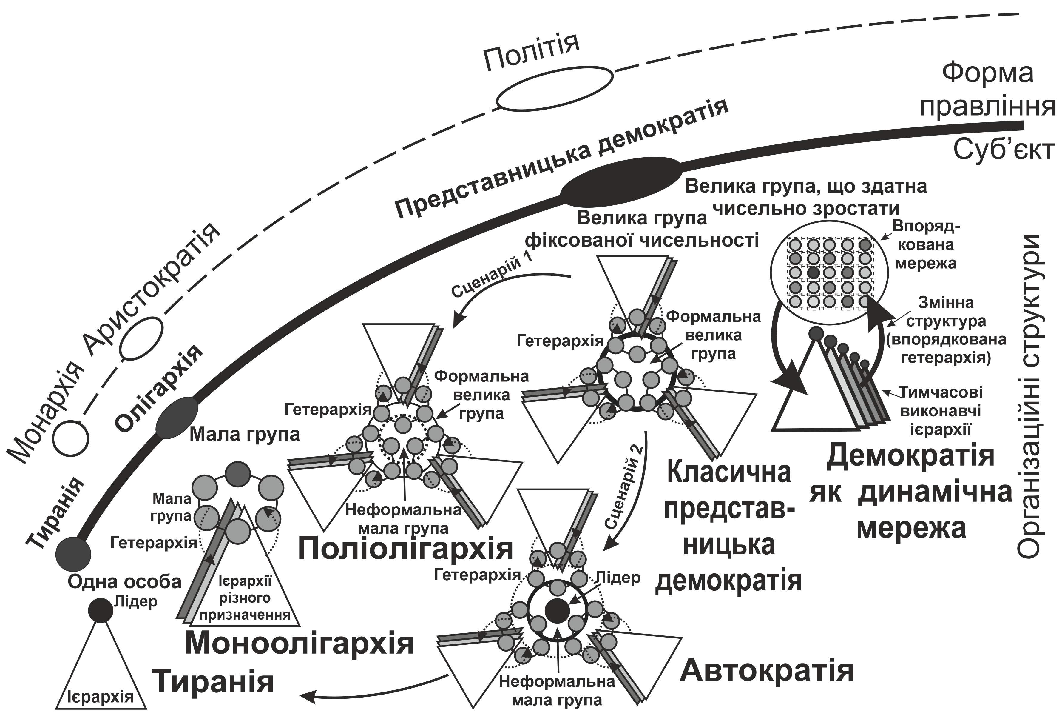 Водночас у роботі [2] нами було представлено організаційні структури основних неправильних форм правління, а також описано процеси виродження більш складних форм правління у простіші. Відповідно, на схемі 1 зображено організаційні структури тиранії, моно- та поліолігархії, класичної представницької демократії, а також змінну організаційну структуру – динамічну мережу, в основі якої лежать інституційні практики українського віча та грецького полісу. Крім того, на схемі показано два базові сценарії виродження демократії до тиранії: перший – через поліолігархію та моноолігархію, і другий – через автократію. Детальний опис цих сценаріїв подано в роботі [2].