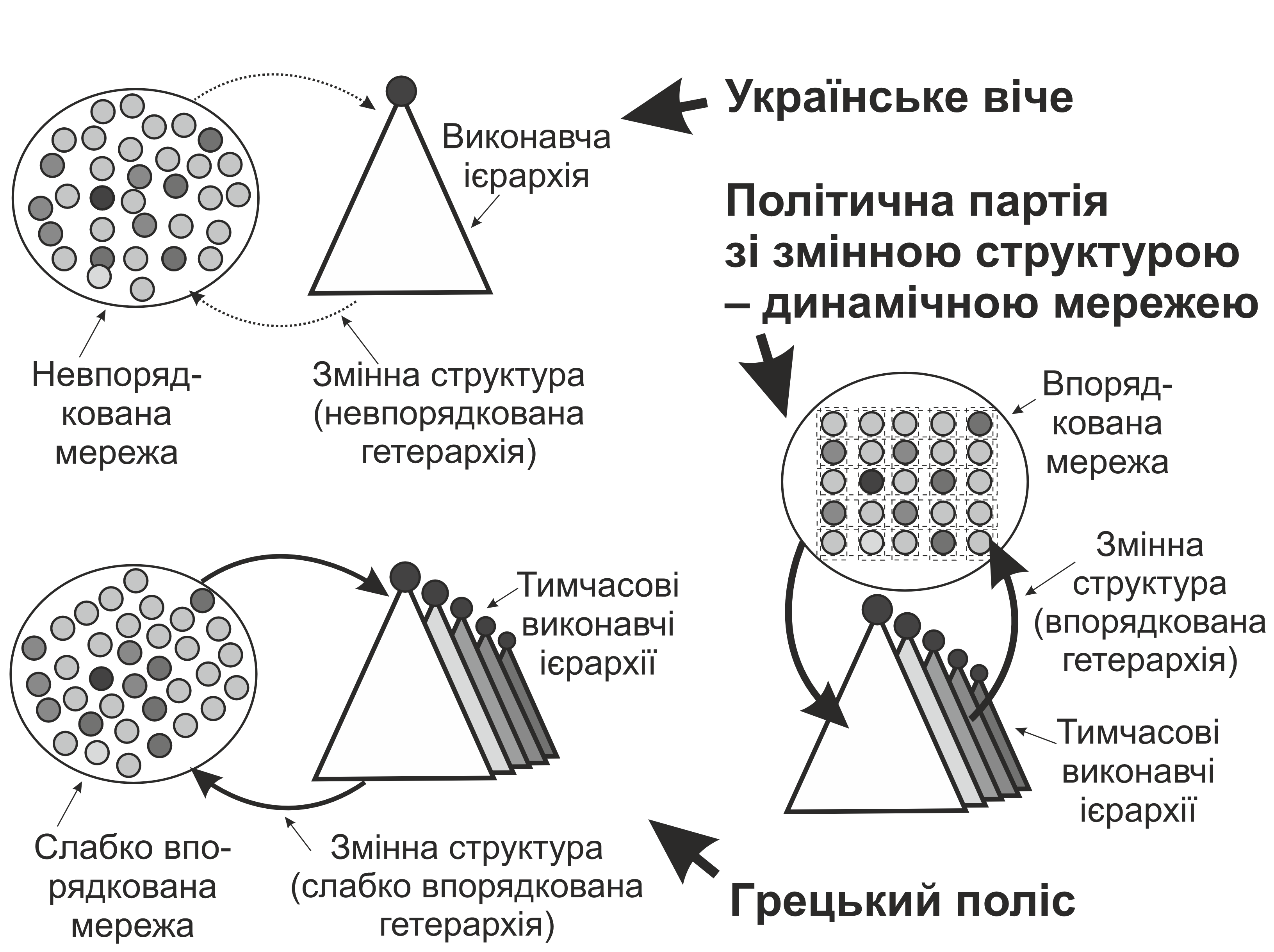 Уникаючи історичних спекуляцій, розглянемо лише технічний бік представлених на цій схемі структурних схем, спираючись на загальновідомі уявлення про віча та грецькі поліси. Тут тільки слід пам’ятати, що ці уявлення сформувалися на основі історичних згадок про обидва ці явища, і зрозуміло, що з різних причин таких згадок про грецькі поліси є значно більше і вони набагато детальніші, ніж згадки про українські віча.