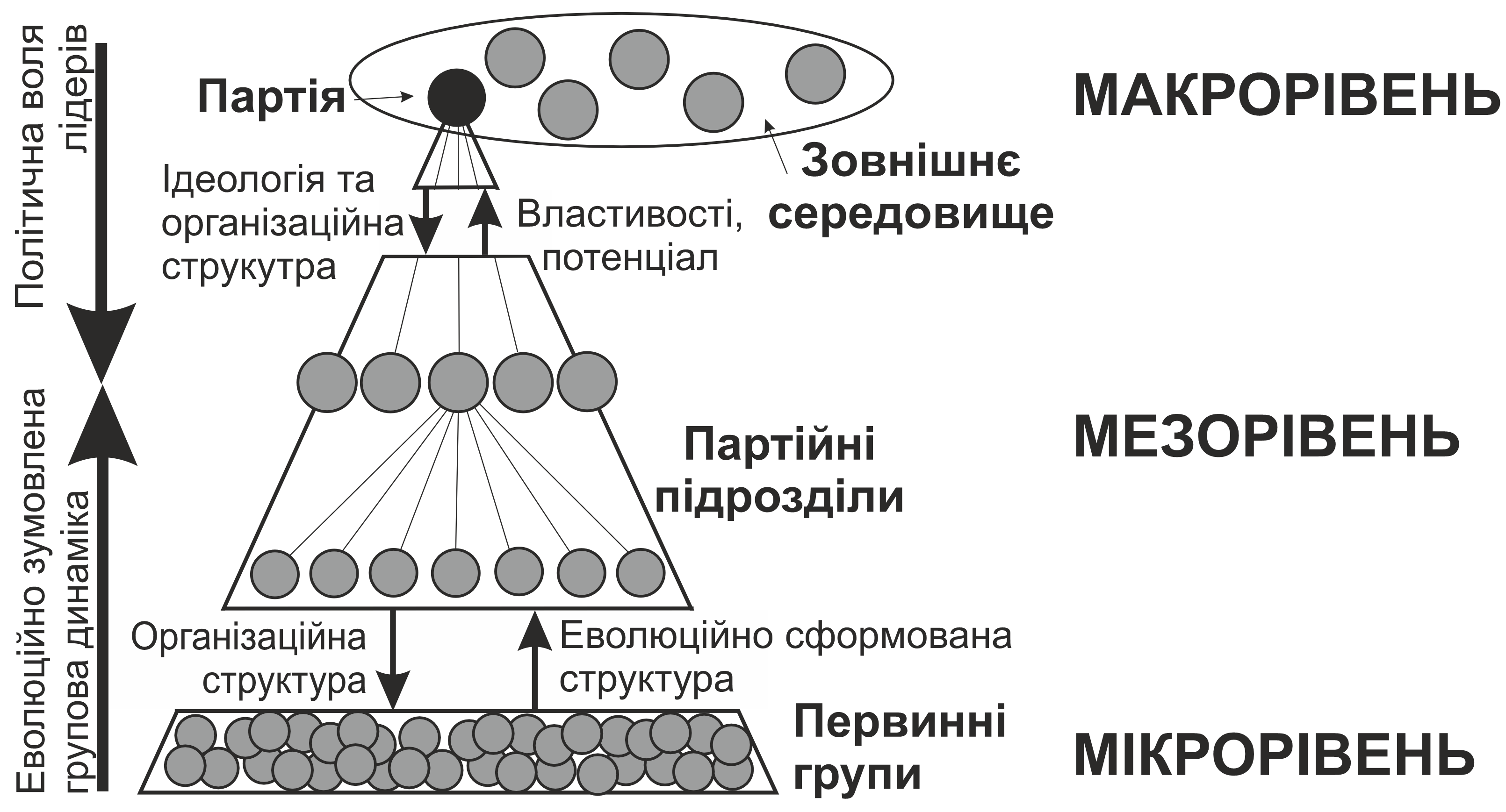 Водночас на мікрорівні політичної партії безперервно утворюється, відтворюється, посилюється та послаблюється множина первинних груп, у межах яких розгортається добре вивчена соціальною психологією групова динаміка. Вона проявляється, зокрема, у структуруванні таких груп у формальні чи неформальні ієрархії внаслідок завершення стадії конфлікту визначенням лідера або лідерської підгрупи. Зазначимо, що мікрорівень у цьому контексті не збігається з рівнями формальних партійних підрозділів: первинні групи виникають як у центральному партійному осередку (наприклад, серед учасників партійного з’їзду), так і в обласних чи місцевих підрозділах – у процесі безпосередньої взаємодії членів і прихильників організації.