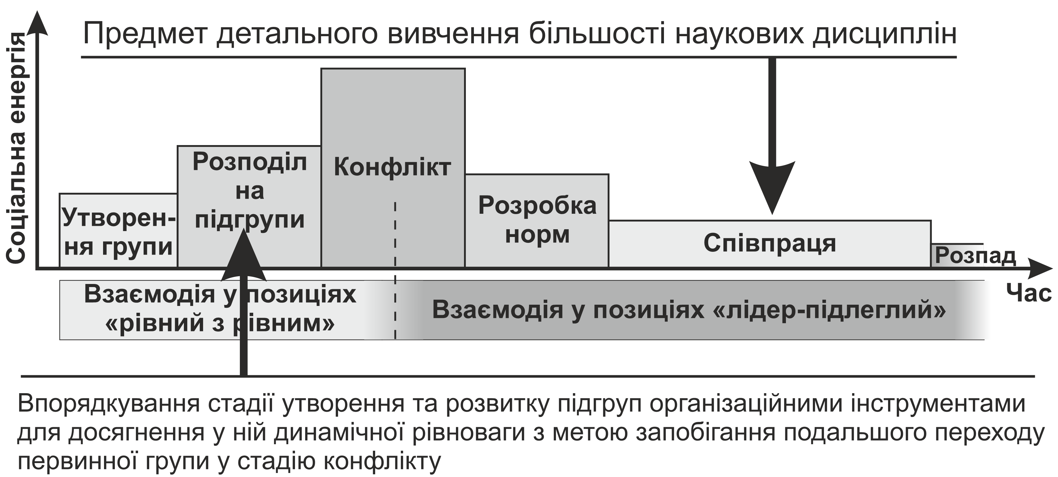 На відміну від більшості наукових підходів, які зосереджуються на стадії співпраці, що настає після стадій конфлікту та нормотворення і передбачає взаємодію членів первинної групи в позиціях «керівник – підлеглий» з активацією відповідних пар архетипів у несвідомому їхньої психіки, нами було запропоновано зосередитися на передконфліктній стадії утворення підгруп. Йдеться про цілеспрямоване випереджальне впорядкування цього процесу з метою тривалого утримання учасників взаємодії в позиціях «рівний з рівним».