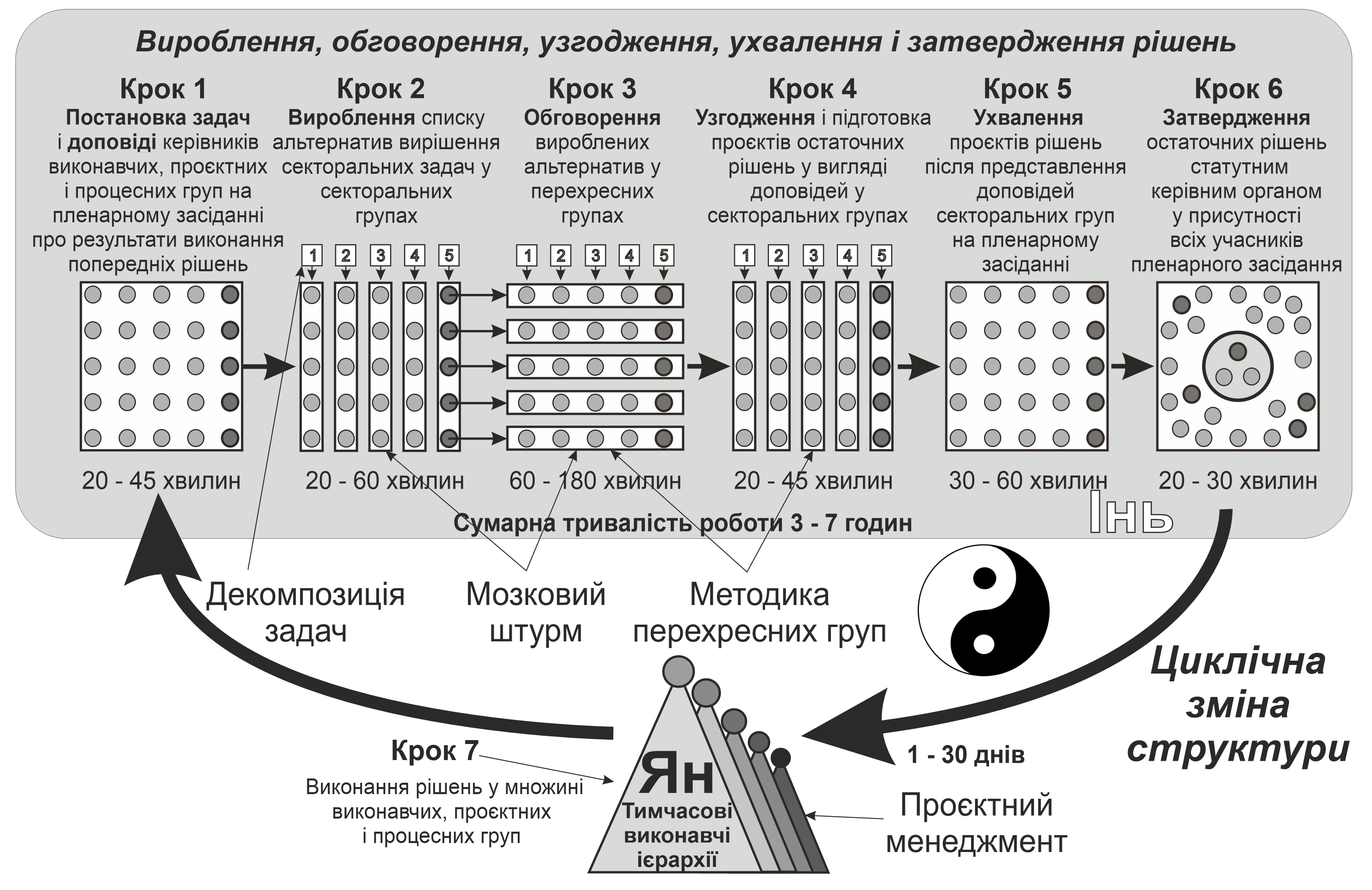 У роботі [4] визначено та інтегровано в організаційну структуру різнорівневих підрозділів політичної партії наступного покоління такі інструменти: декомпозицію цілей і завдань, методику мозкового штурму, методику перехресних груп і проєктний менеджмент (схема 6). Детальний опис змінної організаційної структури – динамічної мережі – і відповідного порядку колективної діяльності подано в цій же роботі.