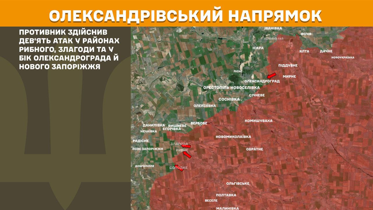 На Олександрівському напрямку противник протягом минулого дня здійснив дев’ять атак у районах Рибного, Злагоди та у бік Олександрограда й Нового Запоріжжя.