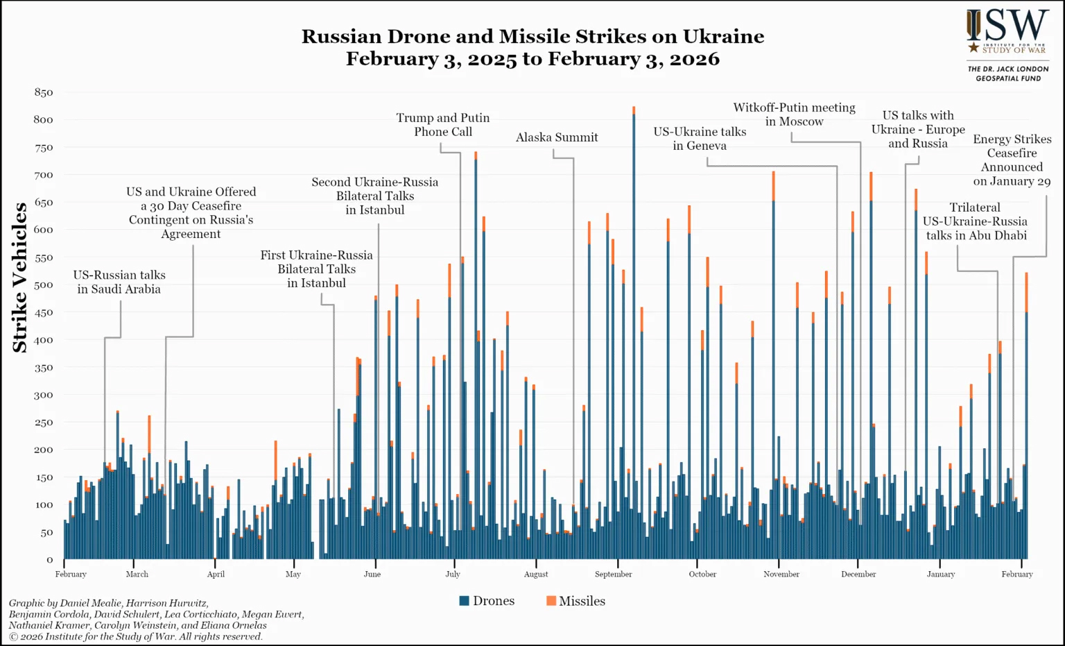 • Росія після короткого мораторію на удари по енергетичній інфраструктурі відновила свою комбіновану кампанію ракетних і безпілотних ударів по українській енергетичній інфраструктурі в ніч з 2 на 3 лютого.