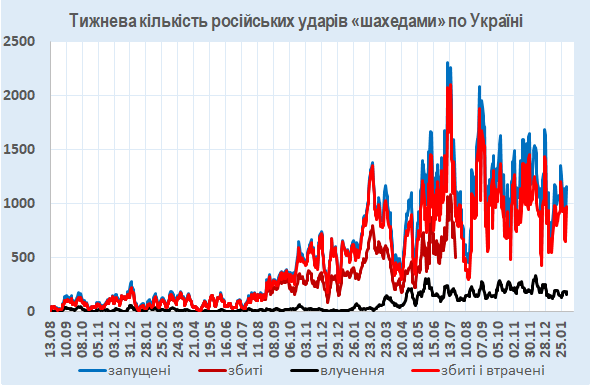 За минулі сім днів було збито чи локаційно втрачено 961 із 1117 запущених по Україні БпЛА (разом – 86%).