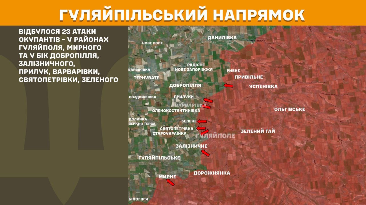 На Гуляйпільському напрямку відбулося 23 атаки окупантів - у районах Гуляйполя, Мирного та у бік Добропілля, Залізничного, Прилук, Варварівки, Святопетрівки, Зеленого.