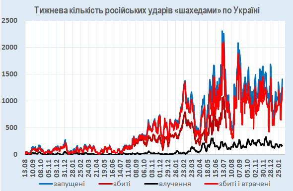 За минулі сім днів було збито чи локаційно втрачено 1250 із 1412 запущених по Україні БпЛА (разом – 89%).