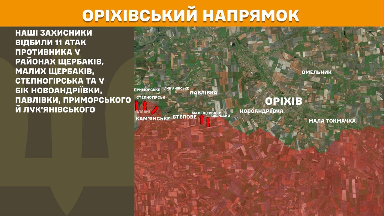На Оріхівському напрямку наші захисники відбили 11 атак противника у районах Щербаків, Малих Щербаків, Степногірська та у бік Новоандріївки, Павлівки, Приморського й Лук’янівського.