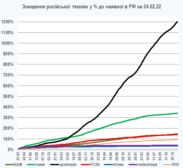 Порівняно зі всією наявною у військах на початок повномасштабного вторгнення в РФ технікою, за час війни знищено: