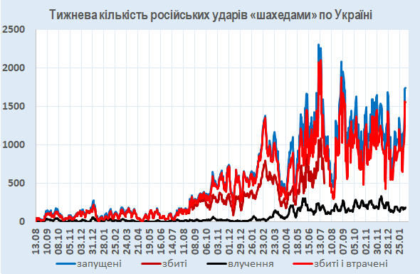 За минулі сім днів було збито чи локаційно втрачено 1561 із 1746 запущених по Україні БпЛА (разом – 89%).