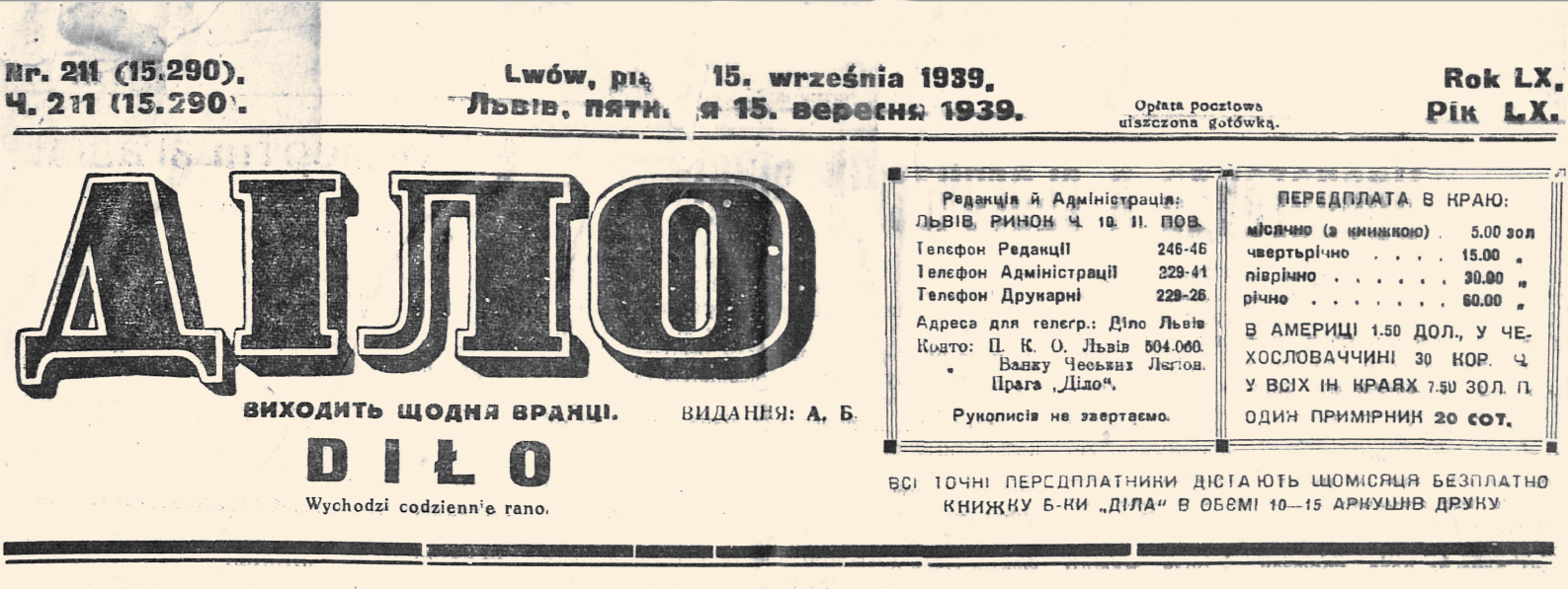 У вересні 1939 р. «Діло» виходило у зменшеному форматі – поступово з восьми до чотирьох сторінок. Два, ймовірно, останні числа від 14 і 15 вересня (ч. 210 і ч. 211 відповідно) були двосторінковими. Сімнадцятого вересня кордон Польщі перейшла Червона армія, а 22 вересня польський генерал Владислав Лянгнер змушений був підписати протокол про передачу Львова радянським військам.