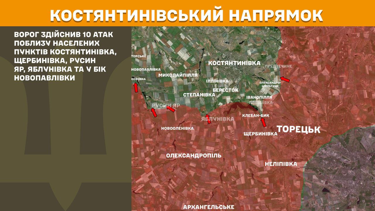 На Костянтинівському напрямку окупанти сьогодні дев’ять разів штурмували позиції наших оборонців поблизу населених пунктів Костянтинівка, Щербинівка, Русин Яр, Яблунівка та у бік Новопавлівки.