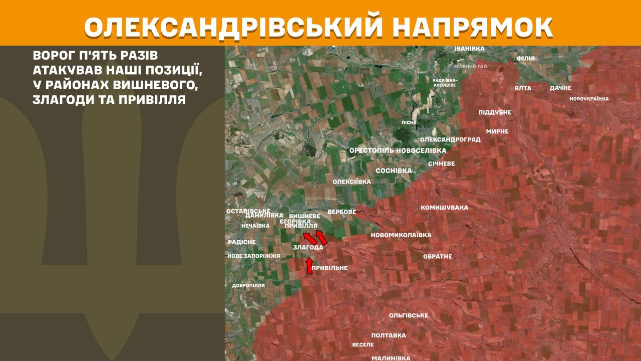 На Олександрівському напрямку ворог п’ять разів атакував наші позиції, у районах Вишневого, Злагоди та Привілля.