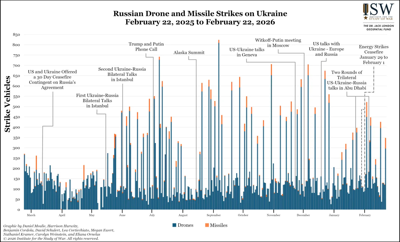 • Вночі з 21 на 22 лютого російські війська провели чергову велику комбіновану атаку і, судячи з усього, змінюють свої цілі з енергетичної інфраструктури на українську водну та залізничну інфраструктуру.