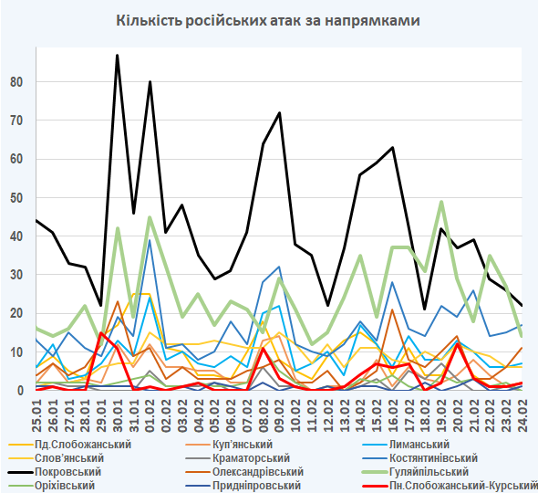 09:05 Інтенсивність російських атак на різних напрямках (за даними зведень Генерального штабу ЗСУ):