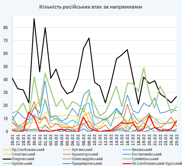 09:05 Інтенсивність російських атак на різних напрямках (за даними зведень Генерального штабу ЗСУ):