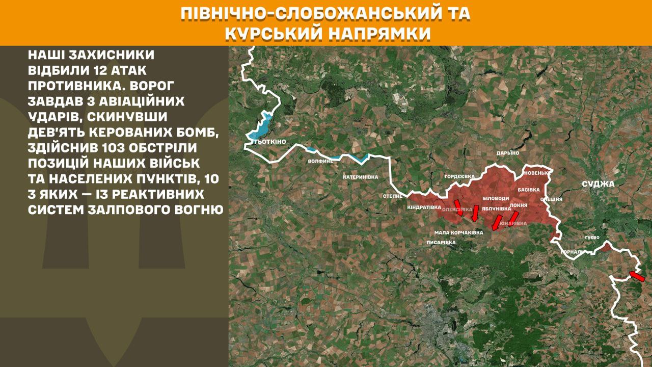 На Північно-Слобожанському і Курському напрямках минулої доби наші захисники відбили 12 атак противника. Ворог завдав 3 авіаційних ударів, скинувши дев’ять керованих бомб, здійснив 103 обстріли позицій наших військ та населених пунктів, 10 з яких — із реактивних систем залпового вогню.