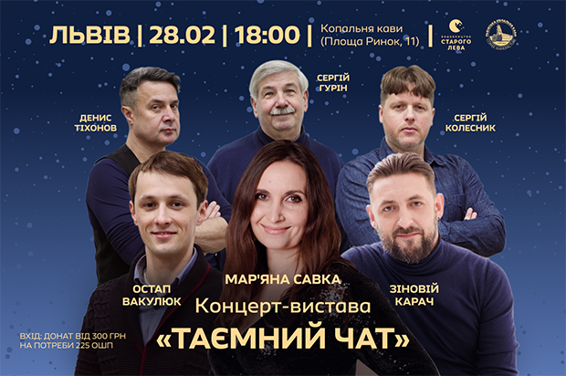 І цього разу лютнева подія від Мар’яни Савки має благочинну мету — збір коштів на авто для батальйону «Морок» 225 окремого штурмового полку ЗСУ. Щоб відвідати львівську прем’єру вистави-концерту «Таємний чат» 28 лютого у Копальні кави, треба зареєструватися та здійснити донат від 300 грн, вказавши в коментарі своє імʼя та прізвище.