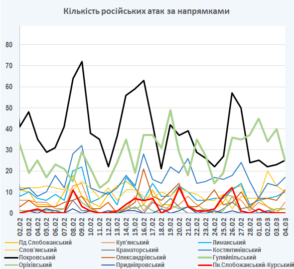 09:05 Інтенсивність російських атак на різних напрямках (за даними зведень Генерального штабу ЗСУ):