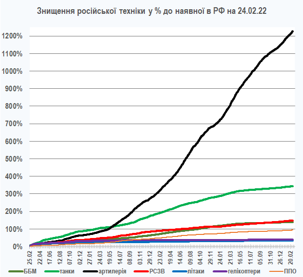 Порівняно зі всією наявною у військах на початок повномасштабного вторгнення в РФ технікою, за час війни знищено:
