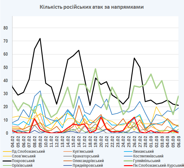 09:05 Інтенсивність російських атак на різних напрямках (за даними зведень Генерального штабу ЗСУ):