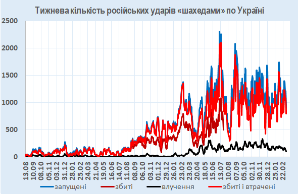 За минулі сім днів було збито чи локаційно втрачено 793 із 903 запущених по Україні БпЛА (разом – 88%).