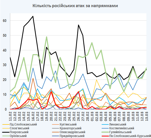 09:05 Інтенсивність російських атак на різних напрямках (за даними зведень Генерального штабу ЗСУ):