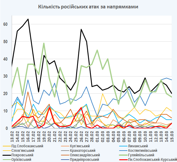 09:05 Інтенсивність російських атак на різних напрямках (за даними зведень Генерального штабу ЗСУ):