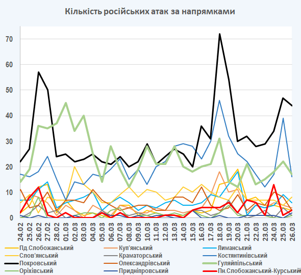 09:05 Інтенсивність російських атак на різних напрямках (за даними зведень Генерального штабу ЗСУ):