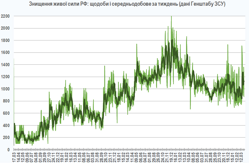 Вчора противник завдав ракетного удару однією ракетою, 70 авіаційних ударів, скинувши 237 керованих авіабомб. Крім того, застосував 9355 дронів-камікадзе та здійснив 3912 обстрілів населених пунктів і позицій наших військ, зокрема 61 – із реактивних систем залпового вогню.