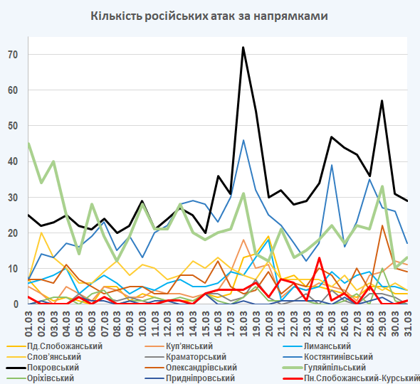 09:05 Інтенсивність російських атак на різних напрямках (за даними зведень Генерального штабу ЗСУ):