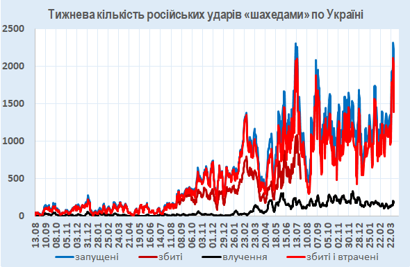 За минулі сім днів було збито чи локаційно втрачено 1393 із 1570 запущених по Україні БпЛА (разом – 89%).