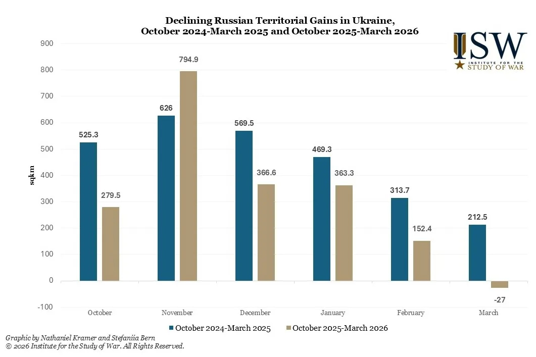 • Ситуація на полі бою станом на кінець березня 2026 року й надалі свідчить про те, що значні успіхи Росії на полі бою, не кажучи вже про повну перемогу, не є ні швидкими, ні неминучими.