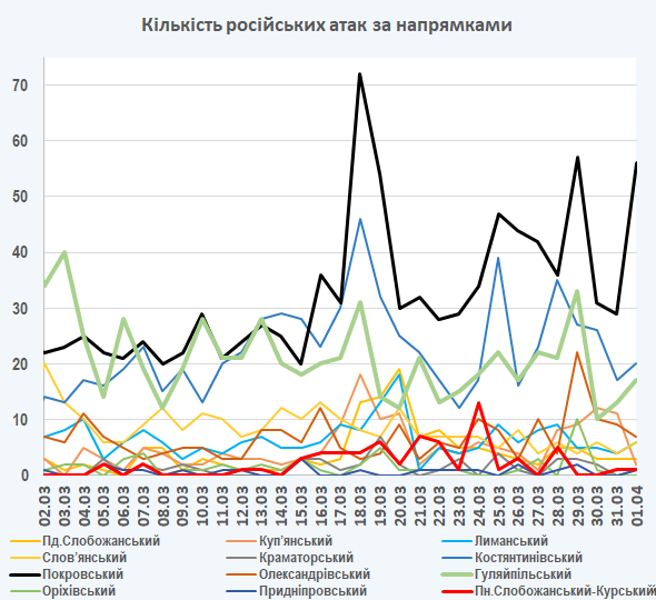 09:05 Інтенсивність російських атак на різних напрямках (за даними зведень Генерального штабу ЗСУ):