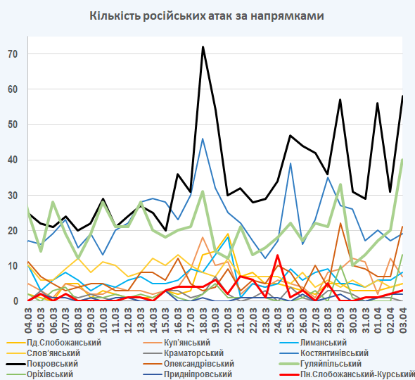 09:05 Інтенсивність російських атак на різних напрямках (за даними зведень Генерального штабу ЗСУ):