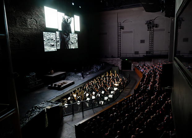 У постановці Серебренікова цей текст сприймається буквально, але алогічно, якщо прийняти його тезу про постапокаліпсис вже у «Золоті Рейну». Зрозумілий сенс поділу сценічного ряду на два просторових рівні – верх (кіно) і низ (музична драма), котрі одночасно розповідають про кінець історії землі – сценічна дія знизу і кіно-дія на широкому панорамному екрані.