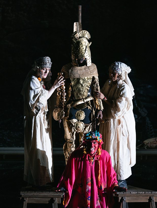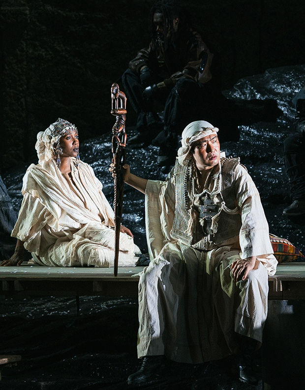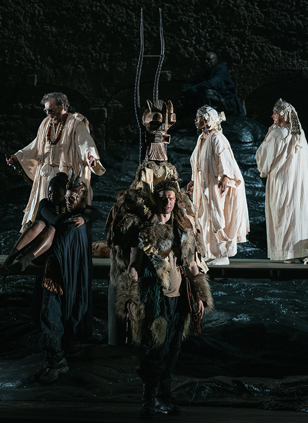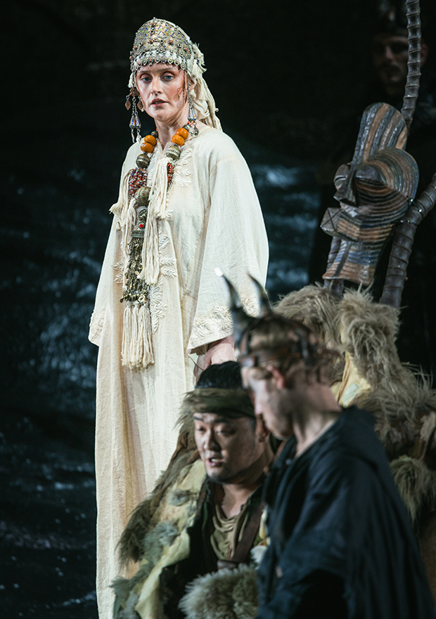 Роль Льоге тут опосередкована (малоцікавий голос Брентона Раяна ще більш підкреслює прохідну роль цього образу). Чому він не напівбог, а тріксер, ілюзіоніст, мандрівний перформер у супроводі асистента-червоношкірого статиста – питання також відкрити. Льоге живе у барвистому пересувному наметі, показує фокуси з чарівною парасолькою або презентує раритетні культові африканські маски і фігури, які, напевно, викрав у людей, які колись їх носили або прикрашали своє помешкання. Пізніше на сцену наче живі скульптури виходять замість Нібелунгів статні воїни-африканці. Очевидно, всі вони колись належали до високого рангу, красуючись розкішними золотими прикрасами, обладунками, шоломами.