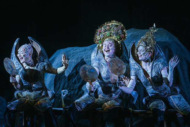Уточню, що дочок Рейну, які пірнають у хвилях мітологічної ріки ми звичайно ж не побачимо. Цих персонажів блискучо розіграли Луізе Флур (Воглінде), Яйє Цанг (Вельгунде), Джес Денді (Флосхільде). Ці далекі від вокального ансамблевого ідеалу чудернацькі істоти постапокаліптичного світу нагадали людину -скорпіона з опери- містерії Йорга Відмана «Вавилон». Його герої теж були свідками екологічних катастроф, а образ Людини-скорпіона – безсмертного свідка космічних катастроф, загибелі цивілізацій – композитор запозичив з давнього епосу про Гільгамеша, найдавнішого літературного джерела шумерів. Але композитор не прагнув етнічних асоціацій.