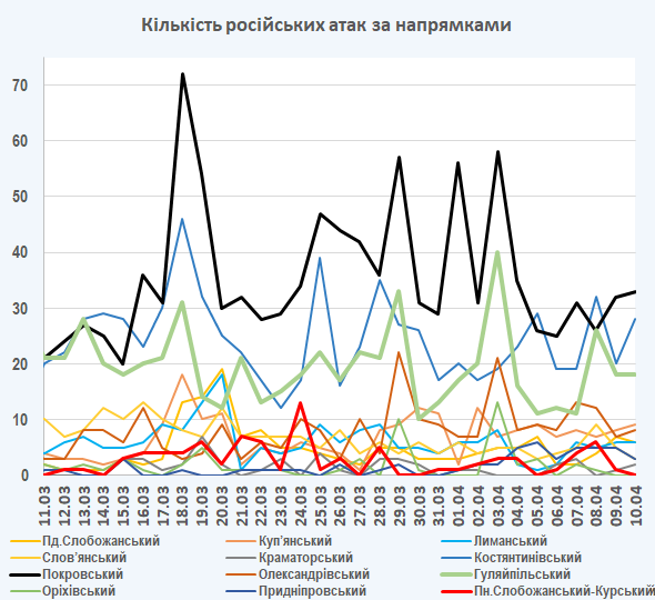 09:05 Інтенсивність російських атак на різних напрямках (за даними зведень Генерального штабу ЗСУ):