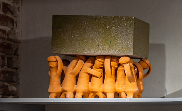 Глиняні чоловічки зібрані в тісний гурт, що нагадує радше один цілісний організм, аніж групу індивідуальних особистостей – скульптура з назвою “Ми є народ”. Або наступна – “Гніт” – ті самі чоловічки, тільки що згорблені та похилені, бо голови й плечі їхні давить якась страшна плита з цементу. Оці з “Ми є народ” ніби чекають на щось або когось, позирають поміж собою непевно, вдають байдужість, але єдина виразна емоція на їхніх глиняних лицях – це очікування. А ось ці з “Гніту”, вже здається, дочекалися.
