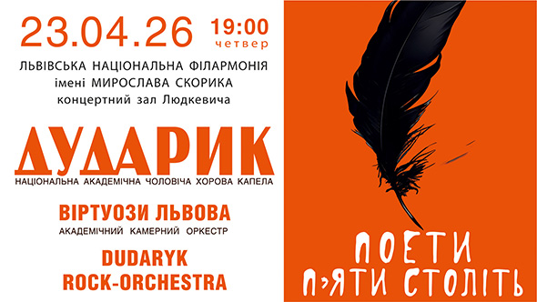 23 квітня 2026 року о 19:00 у Львівській національній філармонії відбудеться концерт «Поети п’яти століть» – особливий музично-поетичний проєкт до Міжнародного дня книги. Подію презентує Національна академічна чоловіча хорова капела «Дударик» разом із друзями.