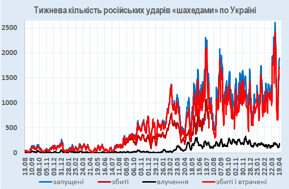 За минулі сім днів було збито чи локаційно втрачено 1714 із 1895 запущених по Україні БпЛА (разом – 90%).