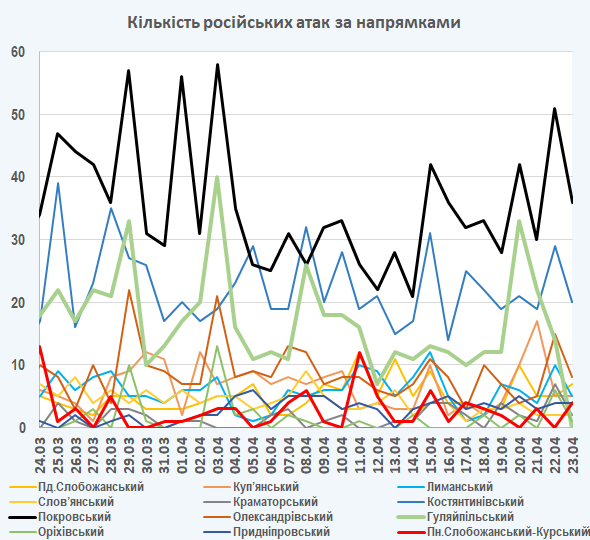 09:05 Інтенсивність російських атак на різних напрямках (за даними зведень Генерального штабу ЗСУ):